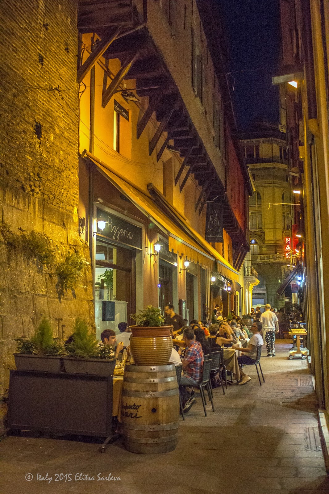 Хотелът ни се намираше в близост до гарата и на около 15тина минути пеша до центъра по централната улица - Via Indipendenza, на която се намираха повечето интересни обекти. През уикенда улицата се затваря и е само за пешеходци, но и през останалото време туристите окупират половината от нея. По самата улица има много китни ресторантчета с малки маси и бели покривки, кафенета и гелатерии (сладоледени къщи). В този ред на мисли, задължително трябва да опитате сладоледа, ако отидете там! Цените са в порядъка от 10 - 15 евро за пица, паста и салата. Пиците нямат размер, всички са големи :)